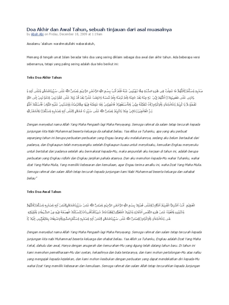 Rasul mengajarkan sebuah doa awal tahun di mana ketika umat islam. Itu pun tidak pernah dilakukan di masa nabi shallallahu 'alaihi wa sallam juga tidak pernah dilakukan di masa para sahabat. Salah satu caranya adalah membaca doa awal tahun serta akhir tahun terlebih dahulu. Allâhumma mâ 'amiltu min 'amalin fî hâdzihis sanati mâ nahaitanî 'anhu, wa lam atub minhu, wa hamalta fîhâ 'alayya bi fadhlika ba'da qudratika 'alâ 'uqûbatî…. Karena doa ini memang diajarkan langsung oleh rasulullah shalallahu alaihi wa salam, maka doa ini adalah doa. Awal tahun dalam penanggalan tahun hijriah ditandai dengan masuknya bulan muharam. Doa akhir tahun hendaklah dibaca sebelum waktu masuk waktu maghrib iaitu pada ketika selepas solat asar atau penghujung waktu asar. Bersempena dengan maal hijrah, umat islam digalakkan untuk membaca doa akhir dan awal tahun. .kita memasuki awal tahun baru 1435 hijriah, yang disebut dengan tahun baru islam. Doa awal tahun dibaca 3 kali selepas maghrib pada malam satu muharram. Doa awal tahun & doa akhir tahun barangsiapa yang membaca doa awal tahun ini, insya allah dirinya akan terpelihara daripada gangguan dan nabi pernah berdiri di atas mimbar pada tahun pertama hijrah lalu beliau menangis kemudian berkata : Sehingga, malam 1 suro 2019 jatuh pada sabtu malam, tanggal 31 agustus. Semoga lafadz doa diatas bermanfaat dan bisa istiqomah kita baca dan amalkan setiap memasuki pergantian tahun hijriah dalam islam.